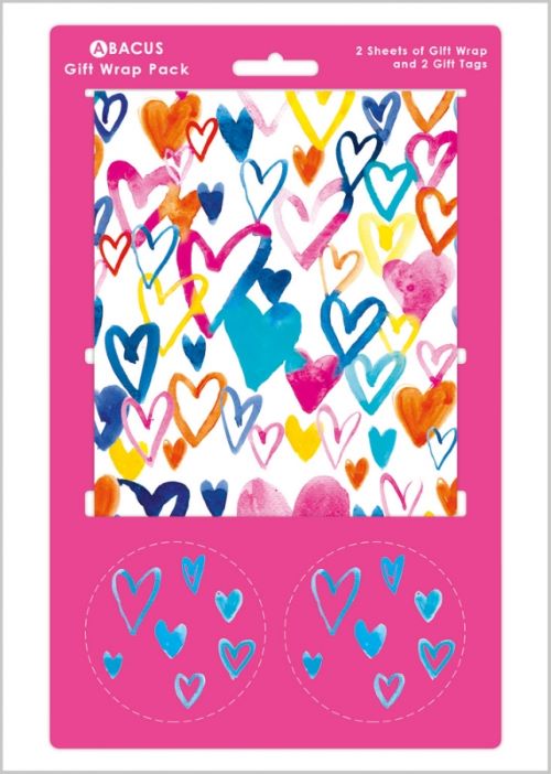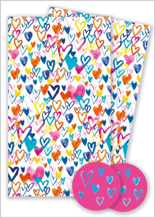 Two sheets of folded gift wrap and two die-cut, self-adhesive gift tags are included in the “Hearts” design. Gift Tag has a diameter of 70mm and a sheet size of 500 x 700mm.