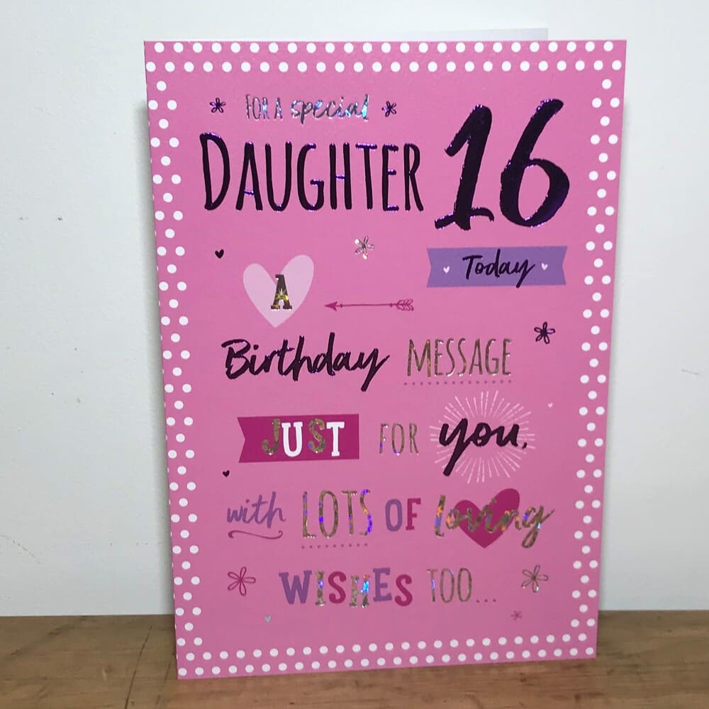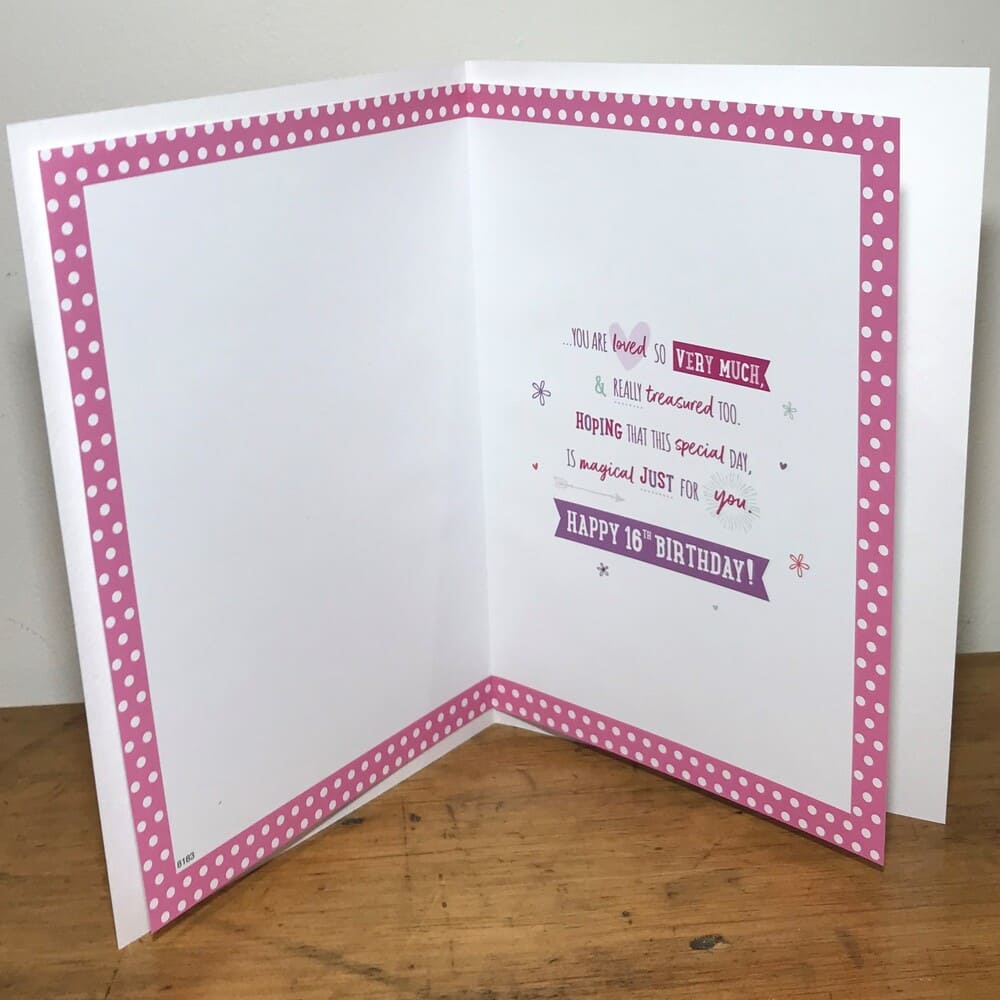 “For a special Daughter 16 Today a birthday message just for you with lots of loving wishes too…” Message inside “…you are loved so very much, & really treasured too. Hoping that this special day, is magical just for you. Happy 16th Birthday!”