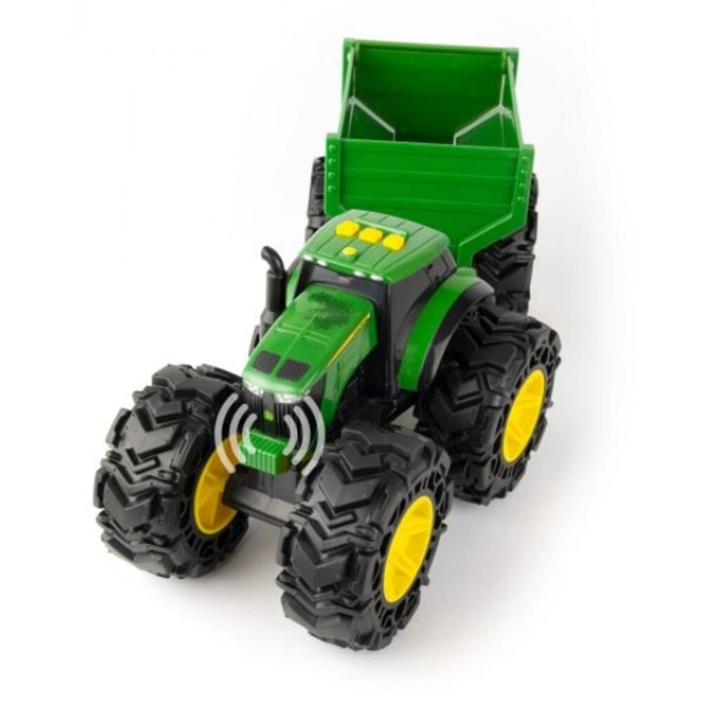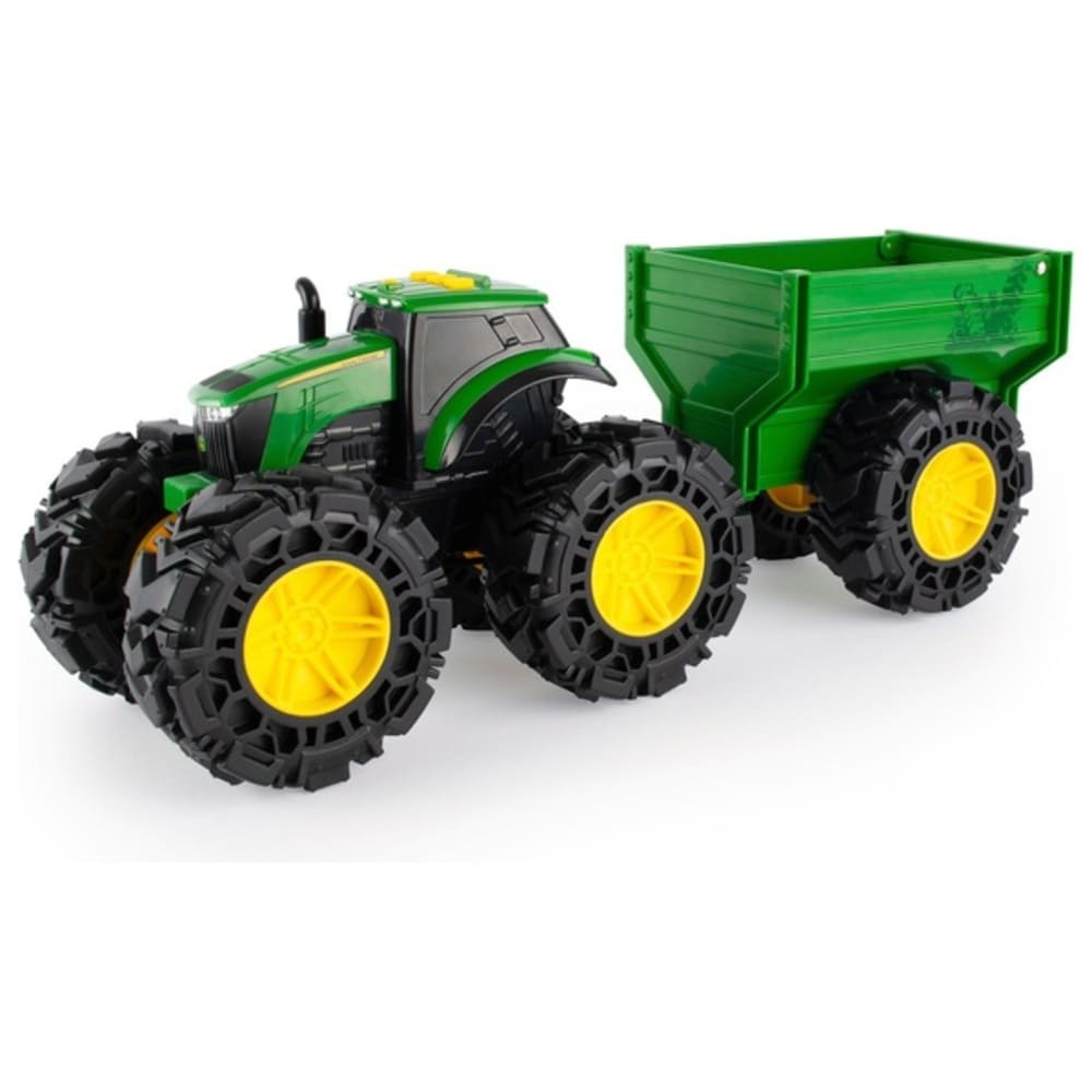 For the best of both worlds, Monster Treads blend the John Deere realism with spectacular monster vehicle style! For added action and off-road adventures, this John Deere toy tractor with wagon has lights, music, and the company’s famous bouncing tyres! Redesigned tyre treads and an opening wagon door are further improvements. The ideal present for the young John Deere enthusiast in your life! Batteries are supplied, allowing the fun to begin immediately.