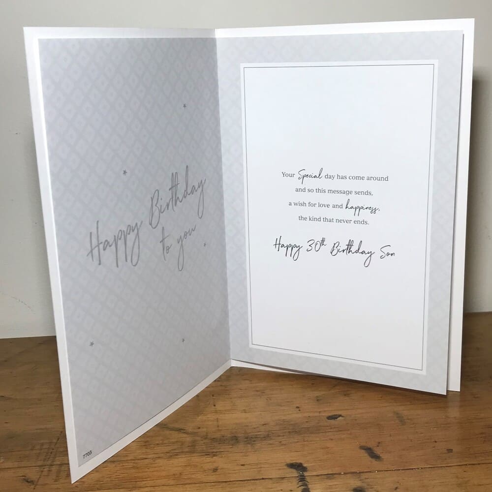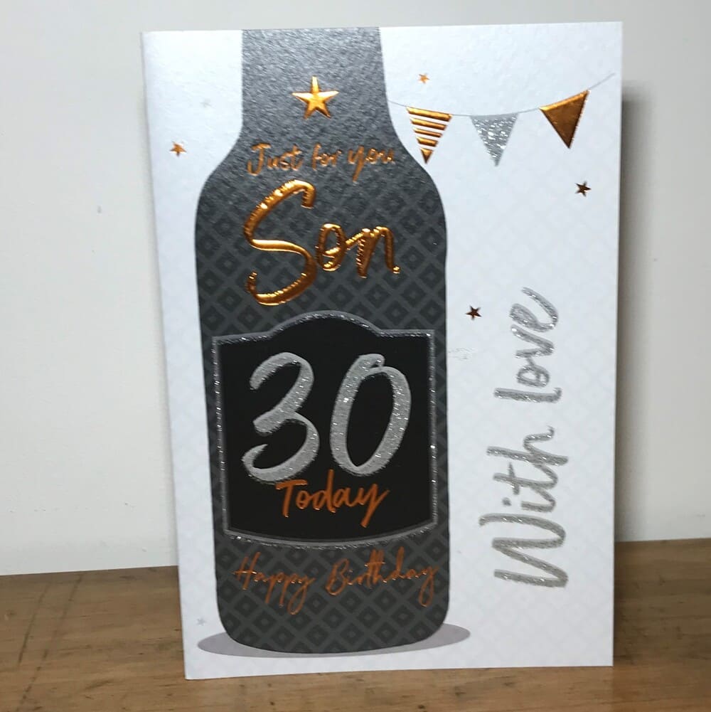 “Just for you Son 30 today Happy Birthday with love”, written in gold and silver letters on a bottle. Message inside continues “Happy Birthday to you” and “Your special day has come around and so this message sends a wish for love and happiness the kind that never ends. Happy 30th Birthday Son”