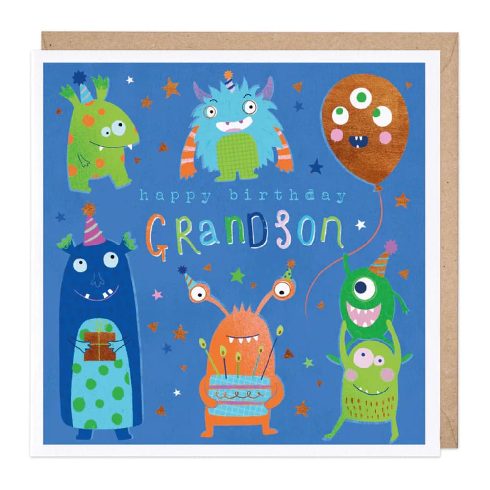 Monster party grandson birthday card with the image of brightly coloured monsters. Card has been left blank for your own special message.